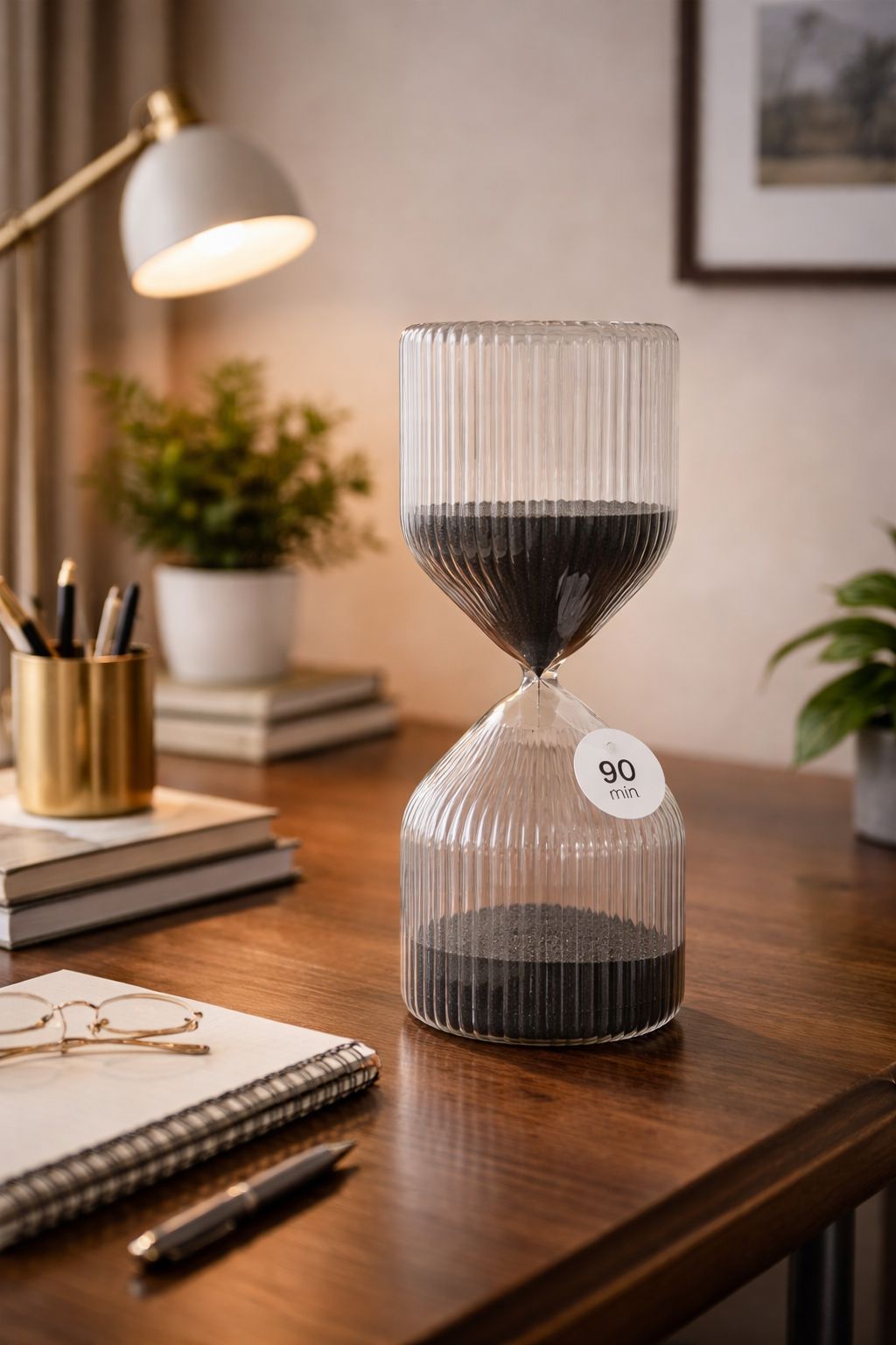 Ampulheta de 90 minutos em vidro texturizado — perfeita para organizar seu tempo com elegância e transformar sua rotina em momentos de foco e produtividade.
