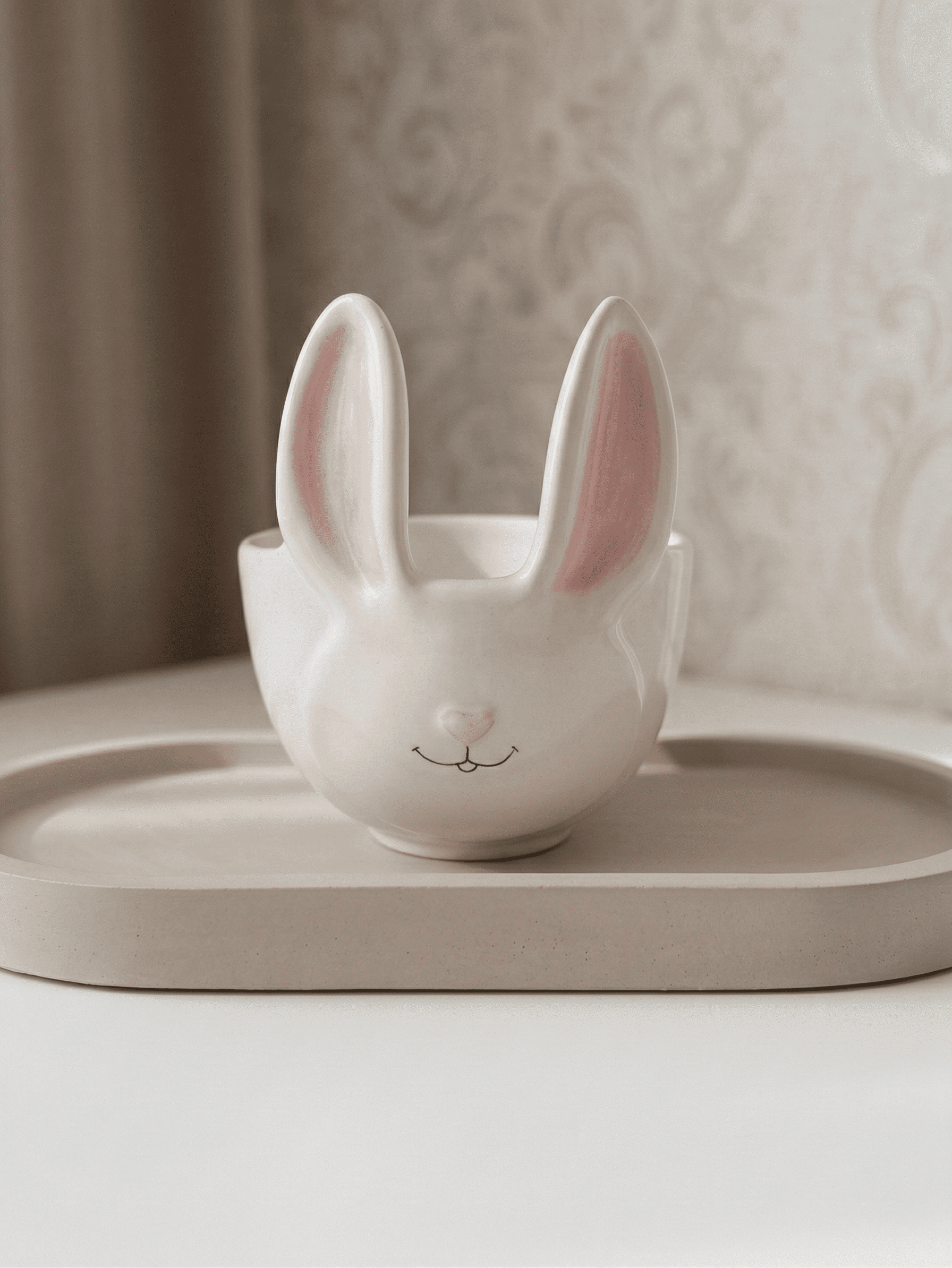 Com um design escultórico e tridimensional, as orelhas que se elevam da borda criam uma silhueta lúdica e apaixonante, transformando o simples ato de servir em um momento de puro encantamento.