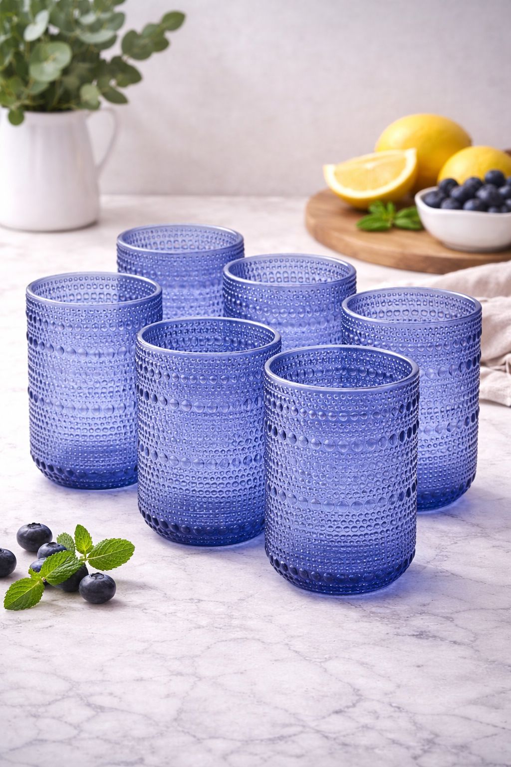 Curadoria e Funcionalidade O Conjunto de Copos Pérola combina o tom azul com uma textura delicada e atemporal. Com capacidade de 460 ml, cada peça apresenta um corpo cilíndrico adornado com pequenos relevos que remetem a pérolas, proporcionando uma experiência tátil única e um brilho diferenciado sob a luz. Com 17,00 cm de largura e 14,00 cm de altura, este conjunto de 6 unidades é a escolha ideal para quem não abre mão de servir com requinte e volume generoso.