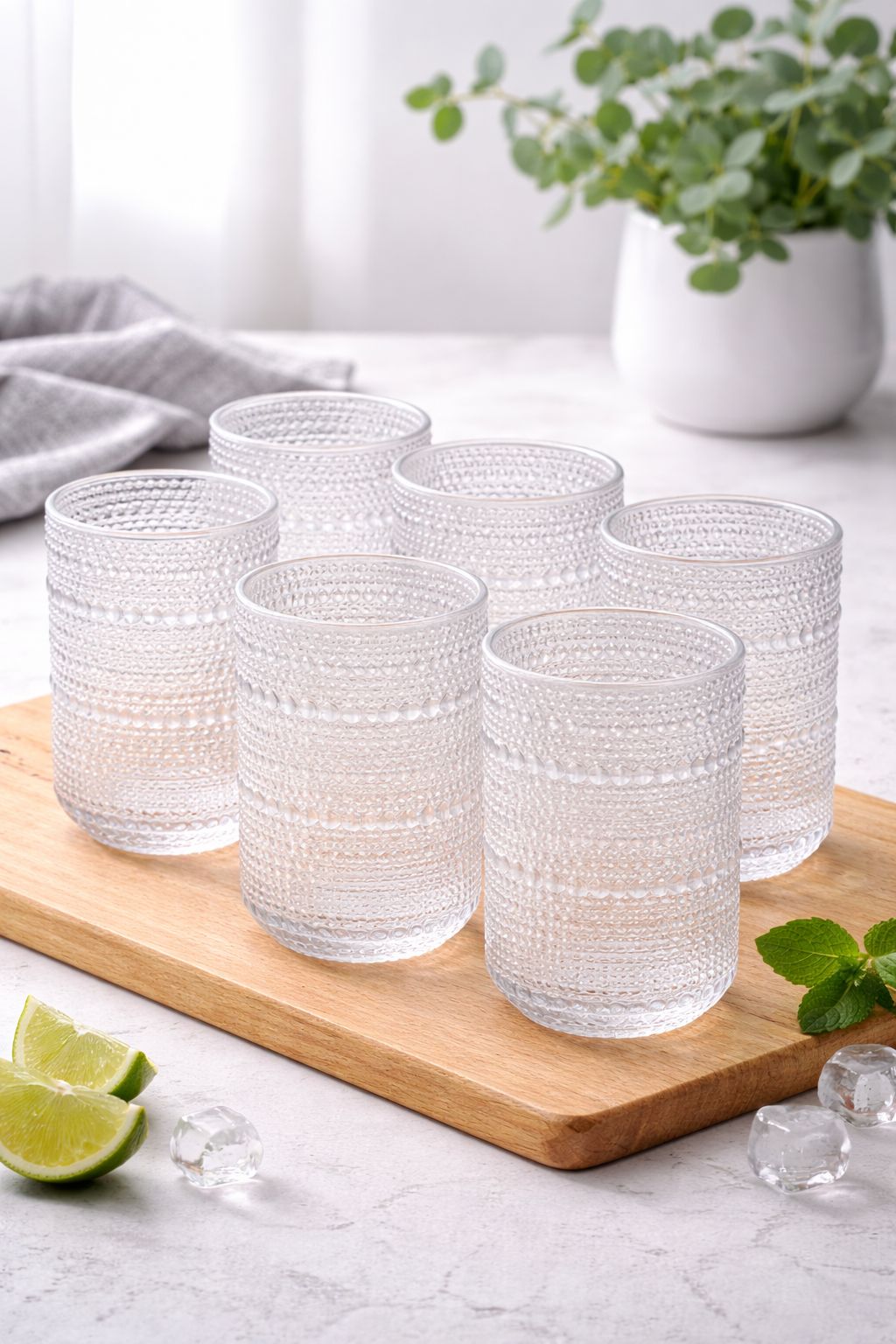 Curadoria e Funcionalidade O Conjunto de Copos Pérola combina a clareza do vidro transparente com uma textura delicada e atemporal. Com capacidade de 460 ml, cada peça apresenta um corpo cilíndrico adornado com pequenos relevos que remetem a pérolas, proporcionando uma experiência tátil única e um brilho diferenciado sob a luz. Com 17,00 cm de largura e 14,00 cm de altura, este conjunto de 6 unidades é a escolha ideal para quem não abre mão de servir com requinte e volume generoso.