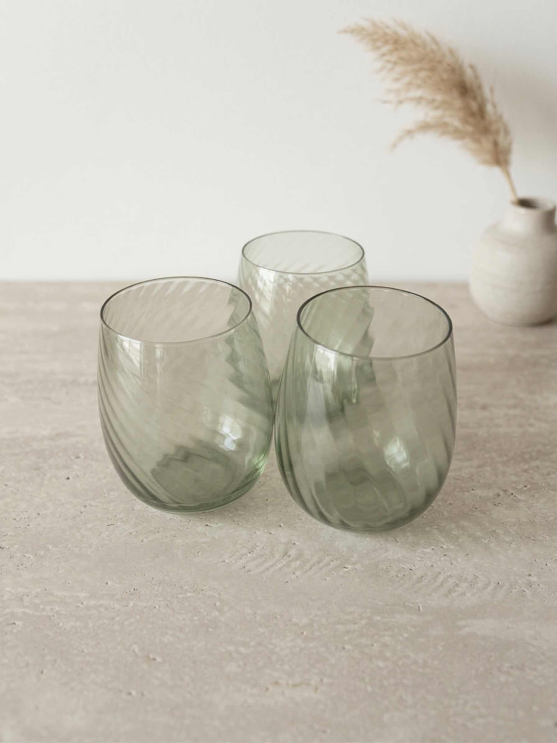 Os copos têm cerca de 11 cm de altura e acabamento em vidro verde suave. O material garante resistência para o uso cotidiano, mas recomenda-se evitar choques de temperatura e impactos para preservar o produto. O kit é indicado para uso doméstico e pequenas festas, unindo estilo e funcionalidade.