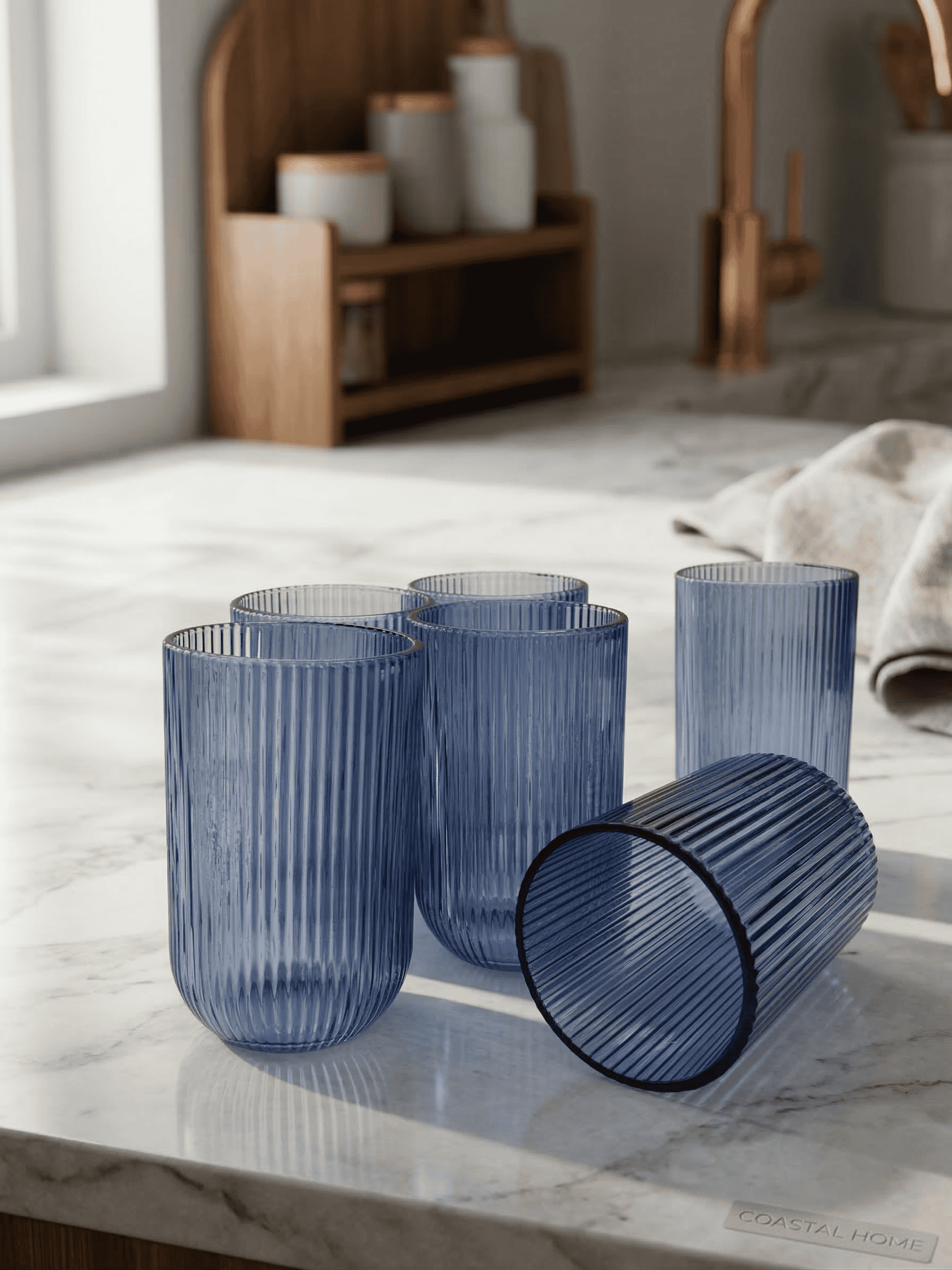 O design canelado vertical proporciona uma textura tátil agradável e um jogo de luz que valoriza o conteúdo do copo.