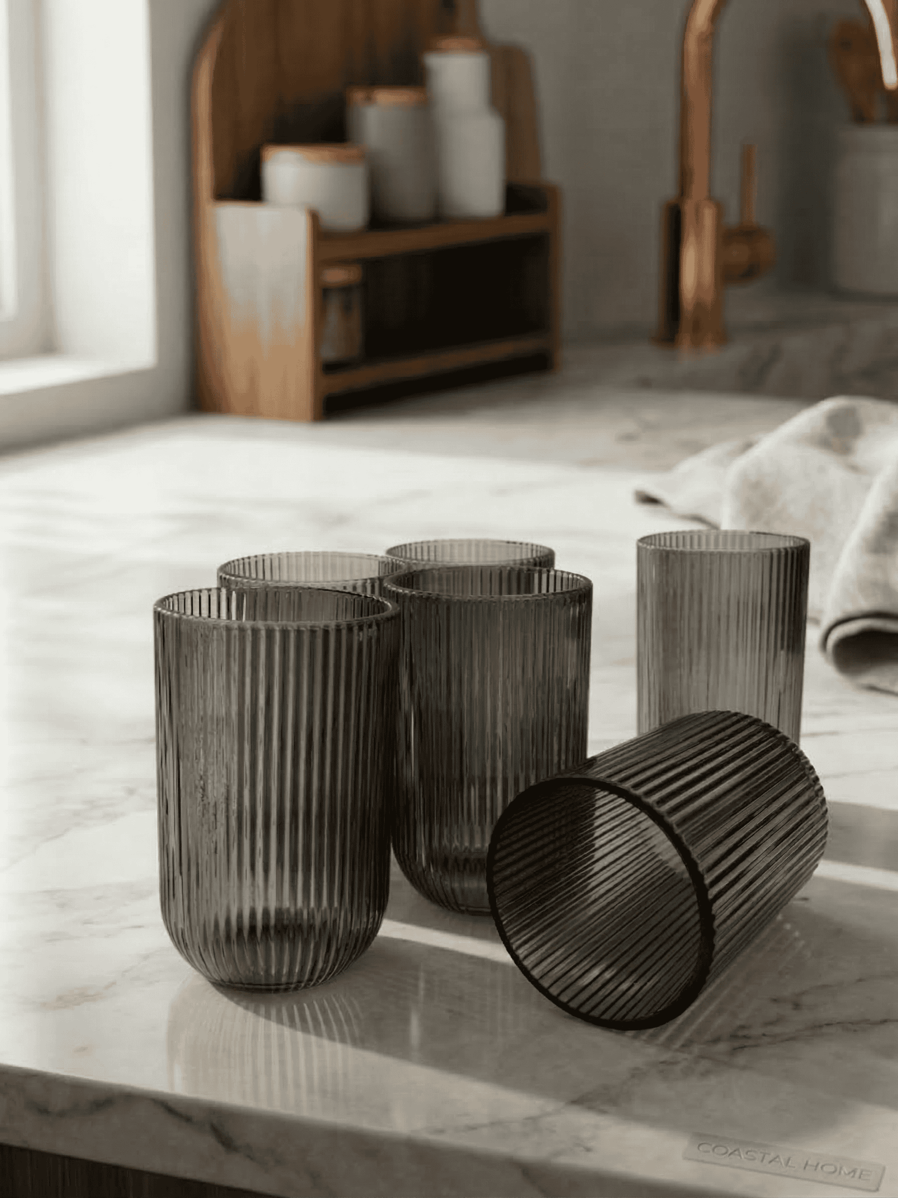 Estes copos harmonizam perfeitamente com louças de cores sólidas, como branco, preto ou azul marinho, criando uma composição de mesa minimalista e chic. São excelentes para complementar jogos americanos de couro ou tecido, funcionando bem tanto em almoços descontraídos quanto em jantares modernos.