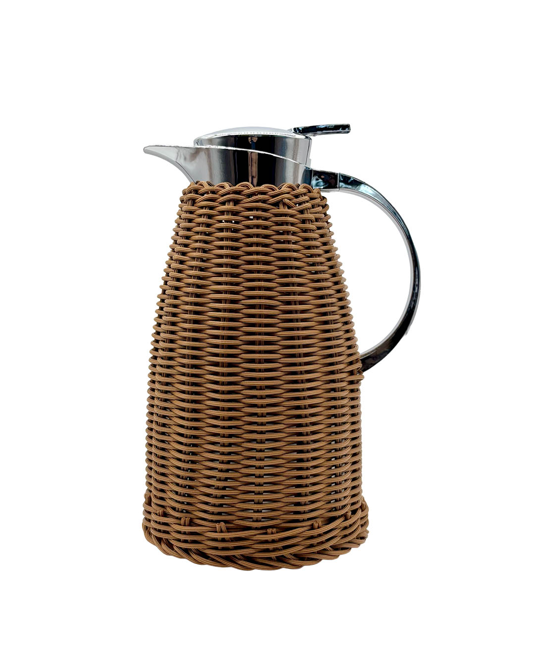 | Garrafa térmica com corpo em aço inox e acabamento estilo rattan em plástico marrom. Ideal para manter bebidas quentes ou frias por mais tempo. Capacidade: 1,5L. |