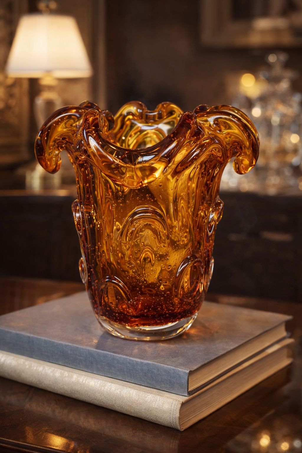 Esta jarra decorativa foi selecionada para o acervo por sua capacidade de fundir o design orgânico com a sofisticação do vidro artístico. Com um tom âmbar profundo e bordas onduladas que remetem ao movimento fluido, a peça funciona tanto como um utilitário de destaque quanto como um objeto de arte autônomo, trazendo calor e personalidade a aparadores e mesas de centro.