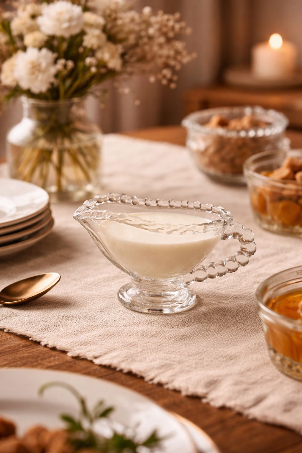 Harmonização Esta molheira é versátil e harmoniza-se perfeitamente com diversos estilos de mesa posta, desde os mais clássicos e formais até os mais românticos e delicados. Combine-a com outros itens da linha Pearl ou com louças neutras para um visual equilibrado e charmoso. Além de servir molhos, ela também pode ser usada para apresentar sobremesas individuais ou até mesmo como um pequeno item decorativo.