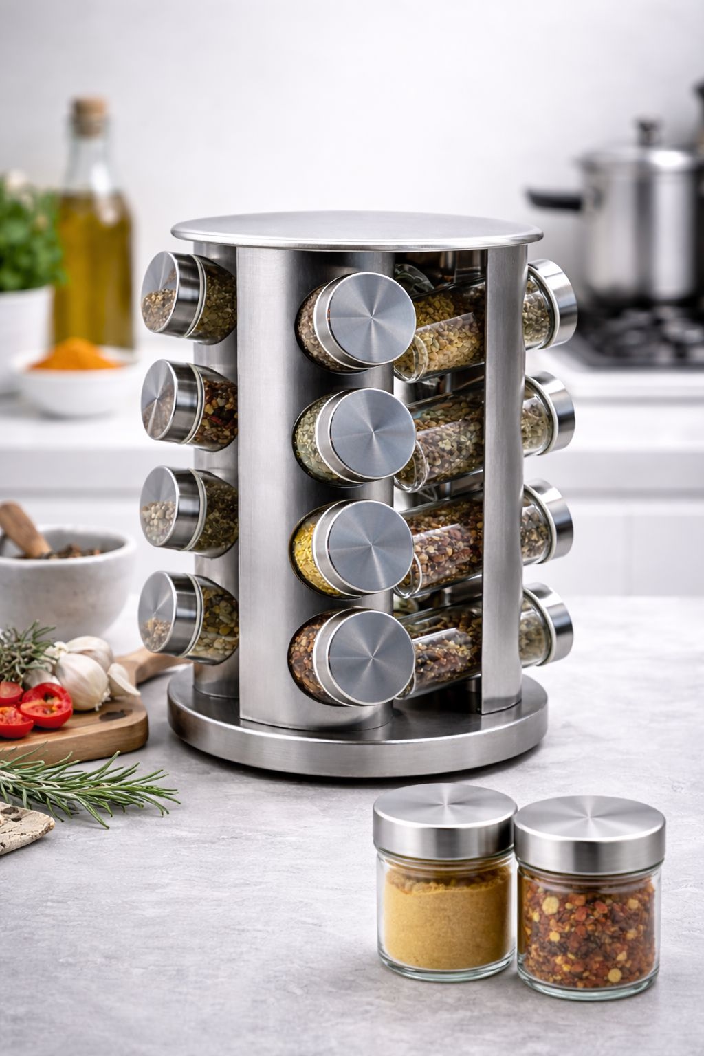 Este porta-condimentos harmoniza perfeitamente com cozinhas de estilo contemporâneo, industrial ou minimalista. Sua estrutura metálica e frascos incolores permitem que ele se integre naturalmente a bancadas de granito, madeira ou inox. Além de funcional, a peça serve como um elemento decorativo que exibe a riqueza de cores das especiarias, adicionando vida e personalidade à área gourmet ou copa.