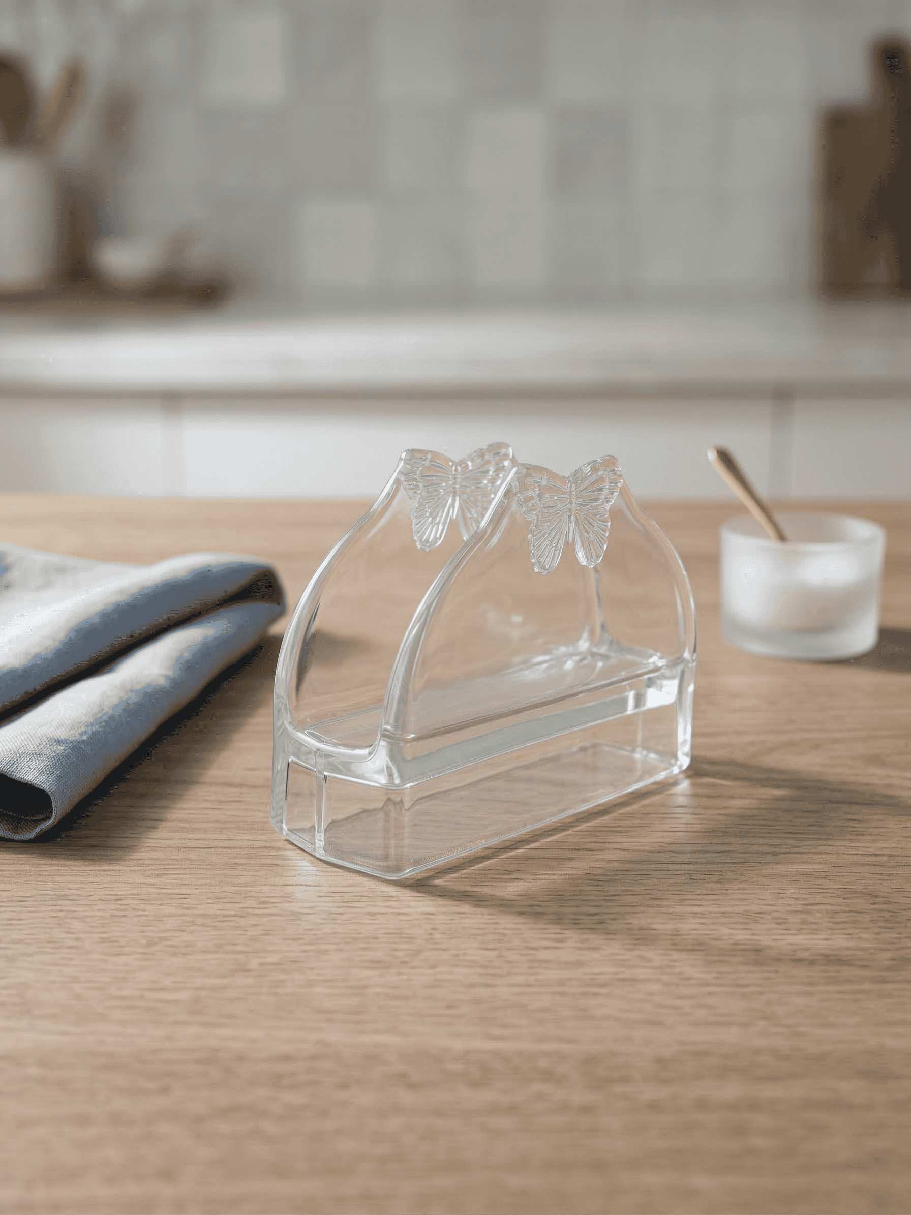 O Porta-Guardanapos Butterfly une delicadeza e praticidade para compor a sua mesa. Com dimensões de 13x4x9cm, esta peça em vidro apresenta um design translúcido e detalhes que remetem à leveza de uma borboleta, sendo o acessório ideal para organizar guardanapos com elegância, sem ocupar espaço excessivo na superfície.